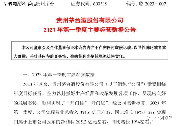 4月17日,貴州茅臺發佈2023年第一季度主要經營數據公告,經茅臺初步核算,2023年第一季度,公司實現營業總收入391.6億元左右,同比增長18%左右; 實現歸屬於上市公司股東的凈利潤205.2億元左右,同比增長19%左右,超過年初15%的增長目標。 在業內看來,這是茅臺酒首次年度營收破千億之後的一季度主要經營數據公示,超出年度目標預期,顯示出茅臺超強的品牌實力更展現出中流砥柱的行業擔當,以盈利的高確定性為行業發展註入強心劑。