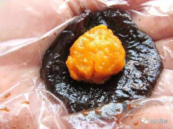 5、把蛋黃包入到豆沙餡中,蛋黃要噴酒烤5分鐘去腥。