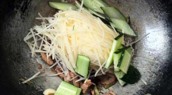 6.接著放入土豆絲和黃瓜片翻炒均勻