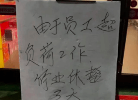 淄博正同時迎接“網紅效應”的甜蜜與煩惱。4月18日,有網友發佈的視頻顯示,山東一傢燒烤店門前,貼出瞭這樣一則通知,“由於員工超負荷工作,停業休整三天。”記者聯系到這傢燒烤店的老板楊先生,他表示由於長達一個多月的超負荷工作,他和妻子及店內30餘名員工都已經累得幹不動活瞭,“現在已經不是錢的事瞭,保命要緊。”