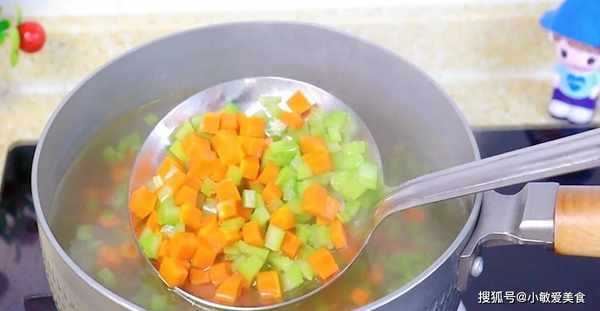 7、提前燒一鍋開水,水開滴幾滴食用油,然後倒入胡蘿卜和芹菜,焯一下水,焯水兩分鐘,控水撈出來,放到涼水中過一下涼。