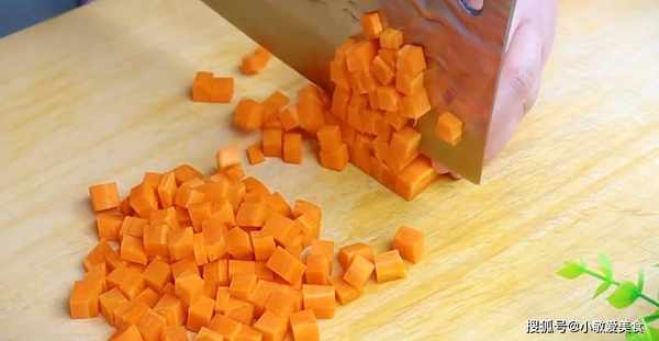 3、利用蒸黃豆的時間,準備一根去皮的胡蘿卜,切成厚片,改刀切成長條,再切成胡蘿卜丁。切好收到盤子裡。