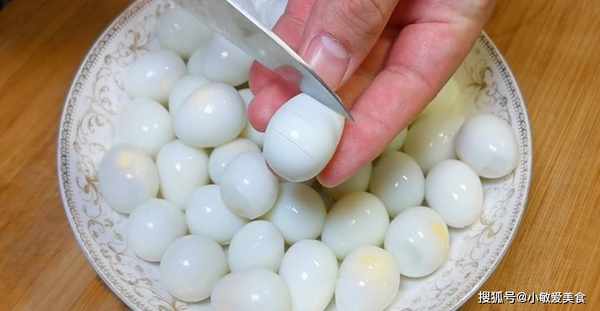 2、等到鵪鶉蛋冷卻後,把鵪鶉蛋剝去外殼,去殼後的鵪鶉蛋在兩面劃一些刀口,這樣會更容易入味。