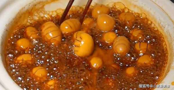 4、15分鐘後打開鍋蓋,把鍋裡的桂皮、香葉等輔料全部挑出,再轉大火把。湯汁收濃一些即可出鍋。一鹵鵪鶉蛋就做好瞭。