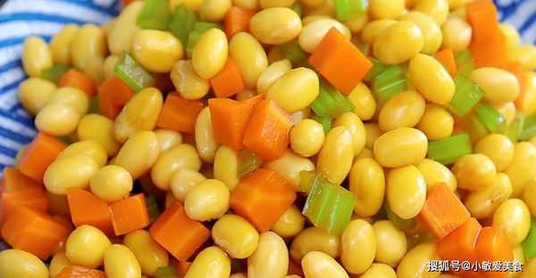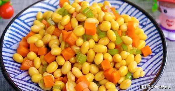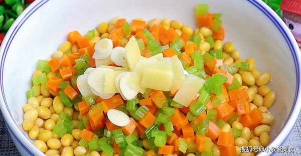 10、把芹菜和胡蘿卜撈出來,控幹水分,放到黃豆裡面,薑片和蒜片也加進來,然後倒入晾涼的料汁,料頭可以提前過濾出去,下手抓拌均勻,裝入盤裡,一道美味的黃豆開胃小菜就做好瞭。