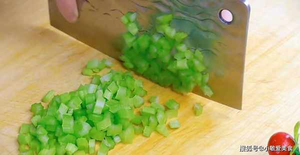 4、準備一把摘洗幹凈的芹菜,把粗的在中間切開,一分為二,再切成芹菜丁。切好和胡蘿卜放在一起。