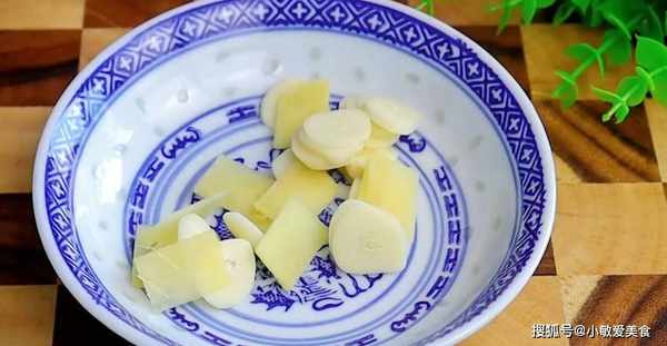5、準備一小塊生薑,切成薄片,兩瓣大蒜,切成薄片,切好收到盤子裡備用。