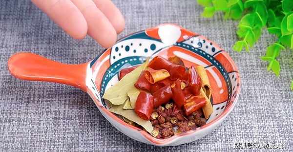 8、準備兩勺的花椒,一個八角,幾片香葉,一小塊桂皮,再來兩勺的辣椒段,這個辣椒段不辣,但是非常的香。