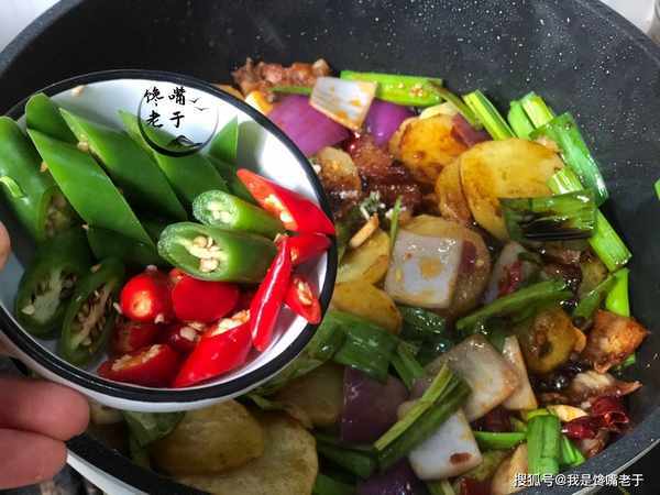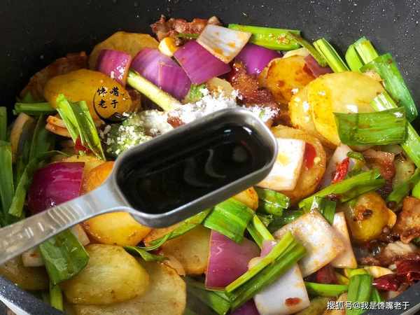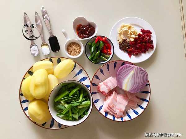 食材:土豆、五花肉、洋蔥、青蒜苗、小米辣、線椒、大蒜、幹辣椒、生抽、蠔油、白糖、郫縣豆瓣醬、熟芝麻、香油