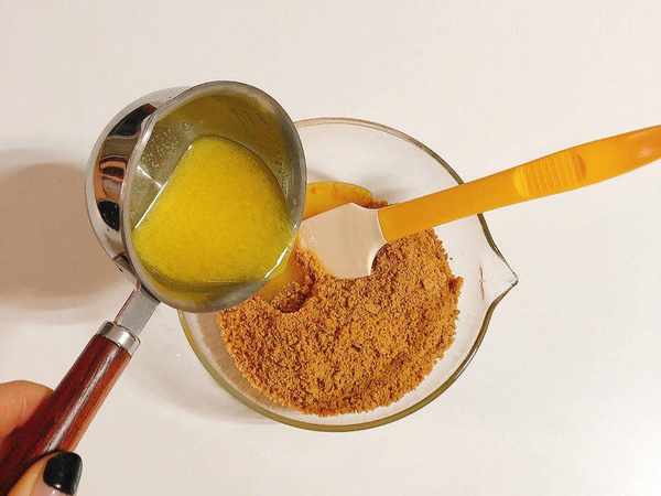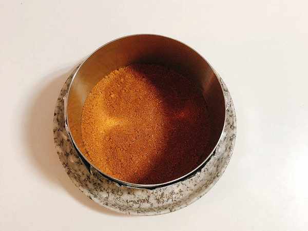 2、倒入模具鋪平並壓實,放入冰箱冷藏備用