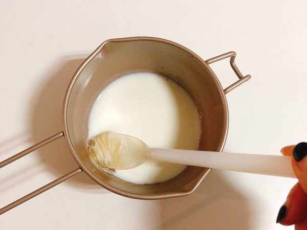 5、泡軟的吉利丁片加入到溫熱的牛奶?中攪拌融化