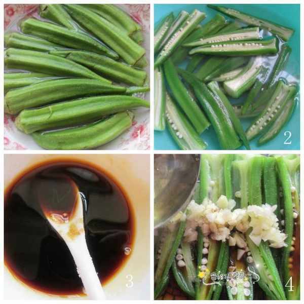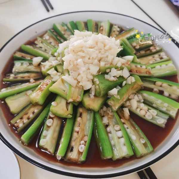 蒜蓉秋葵做法:1,卫生裤汆燙撈到冷水中過凉,從中間一切兩半。2,碗裏放入醋,生抽,鹽攪拌均勻。3,把燙好的秋葵擺到盤子中,倒入料汁,上面放上蒜蓉。4,另起鍋燒熱油,潑在蒜末上即成。