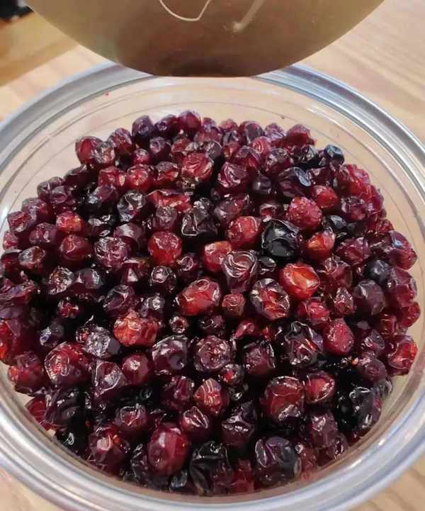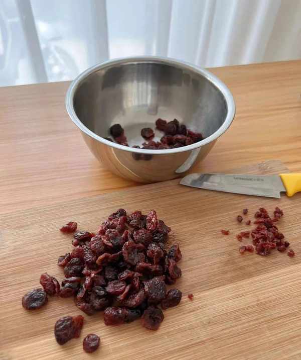 將蔓越莓幹清水洗凈後吸幹水分或者晾幹,把蔓越莓幹切碎