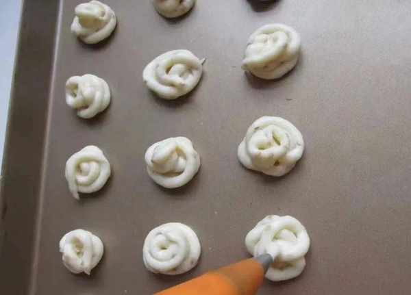 倒入切碎的蔓越莓幹,打蛋器攪拌均勻即可,倒入裱花袋,烤盤鋪油紙,擠上面糊,面糊的尖角可以手指蘸點清水,輕輕抹平,蒸烤箱提前200度預熱10分鐘,放入中層,180度,烤25分鐘取出