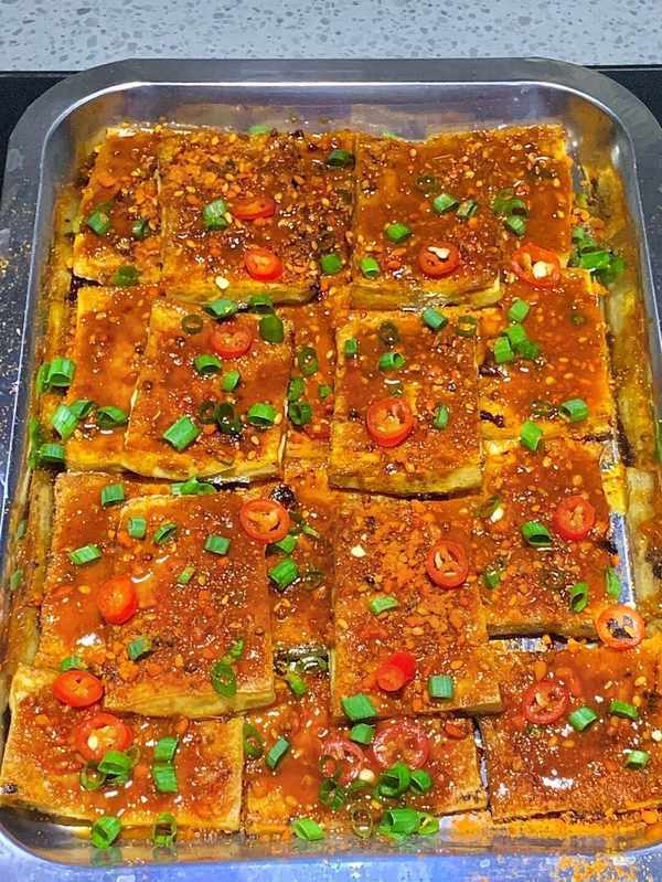 鋪上鐵板,放入煎好的豆腐塊和炒好的青辣椒、紅辣椒和洋蔥,淋上調料,放入烤箱200度烤20分鐘,直到湯汁收幹,豆腐與青紅椒肉類充分混合。