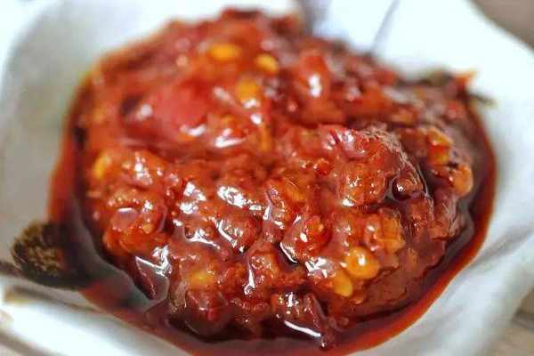 這裡的辣椒皮薄肉厚、易切成絲,皮肉不分離、口感香綿。聰明的新疆人因地制宜,在傳統發酵工藝,和爽口微甜的天山雪蓮加持下,制作出瞭這種剔透紅亮的辣醬。