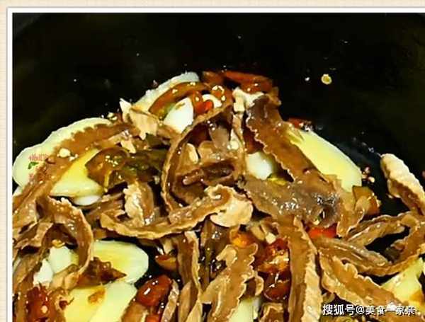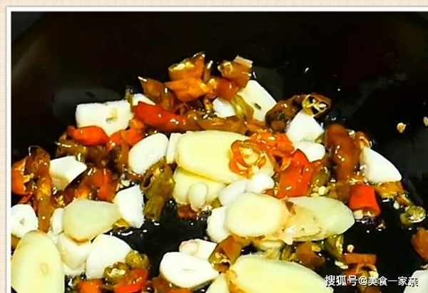 倒入適量食用油,入薑蒜炒出香味,再把泡椒和筍幹倒入鍋中過熱油炒出的香味,續翻拌均勻即可,