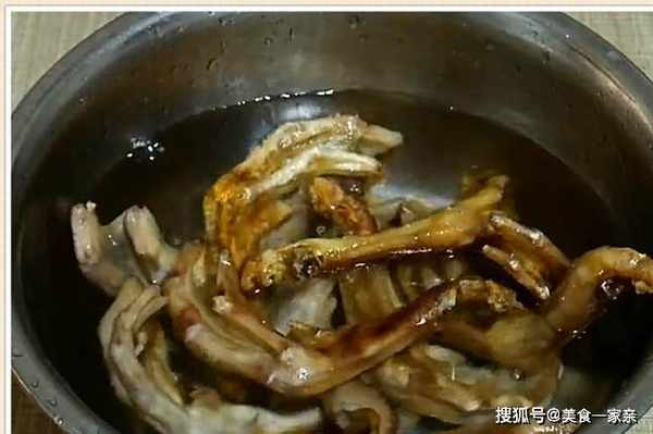 炸至鴨掌表皮金黃就可以控油撈出來瞭,再準備一盆冷水,把炸好的鴨掌放進去泡30分鐘,這是為瞭讓炸過後的鴨掌吸足水分,表皮變得膨脹回軟,在接下來的環節中能更容易入味。