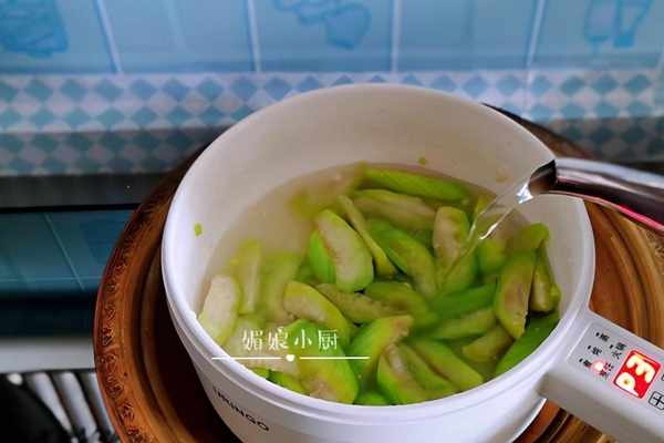 ②、鍋燒溫熱,加少許油,下入蒜粒炒香,鹽醃制過的絲瓜清水沖洗瀝幹水,下入鍋裡翻炒半分鐘,加入2小碗量的開水,保持鍋內沸騰狀態煮1分鐘