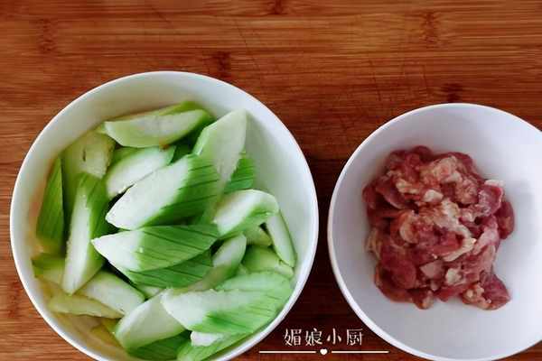 做法:①、絲瓜輕輕地刮掉表皮,沖洗幹凈切滾刀小塊,裝碗加2克鹽拌勻防止絲瓜顏色變黑。瘦肉溫水清洗切細條,裝碗加1湯匙生抽、1湯匙料酒,1小勺紅薯淀粉拌勻