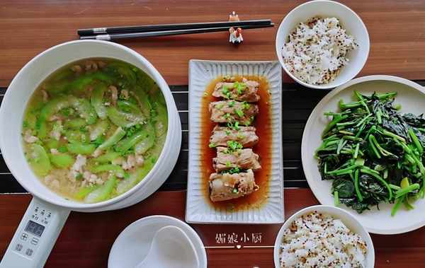 午餐:藜麥飯|清蒸排骨|清炒紅薯葉|絲瓜湯三餐飲食吃七八飽就好,主食建議一餐吃自己拳頭大小的量就夠,最好是粗細搭配。要做起來也並不難,蒸米飯減少一點精米的量,添加少量的糙米、燕麥米、玉米渣等粗糧,或是紅薯、土豆、山藥、南瓜等根莖類食物。煮糙米飯的話用1份糙米2份精米,糙米記得提前浸泡半小時,浸泡的原水一塊倒入鍋裡煮飯,營養不流失。我經常煮藜麥飯,現在買的藜麥基本上都是去除皂苷免浸泡的,輕微淘洗後就可與大米混合煮飯。