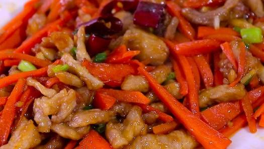 5.放薑蒜,放入胡蘿卜絲爆炒至油變紅,倒入炒好的肉繼續翻炒