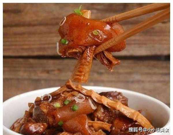 材料:豬蹄、筍幹、薑片、料酒、薑汁、老抽、鹽