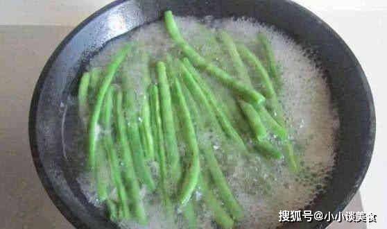 3.鍋中燒開水。水燒開後,加入四季豆煮。瀝幹水並放在一邊。
