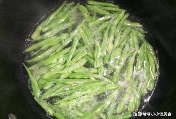 準備:1將綠豆洗凈,切去頭尾,去掉上部的蒂,用刀切成條備用。