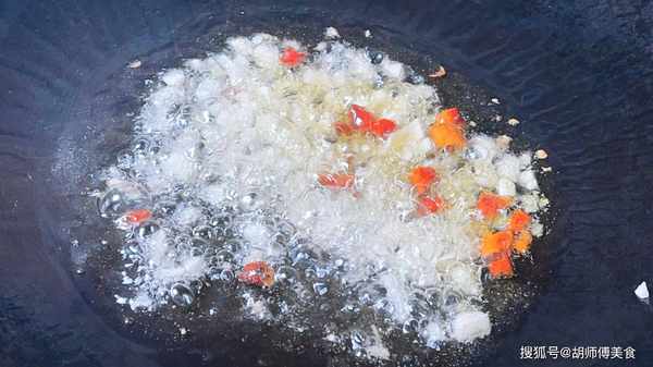 第二步:鍋中放入適量油,等油溫燒到6成熱時,將幹辣椒段、蒜末全部放入到鍋中爆香3秒。