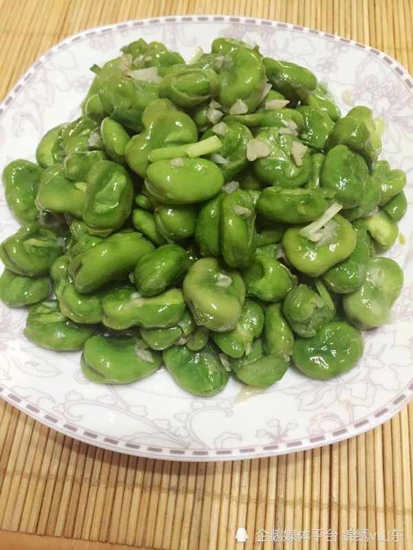 1.熱鍋下冷油,油稍熱後放蒜片,煸出香味,放蠶豆翻炒到豆子顏色變綠變深