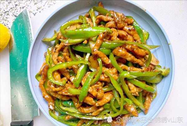 食材:豬肉裡脊肉300克;青椒2個;薑蒜適量;料酒、鹽、生抽、淀粉、油各適量
