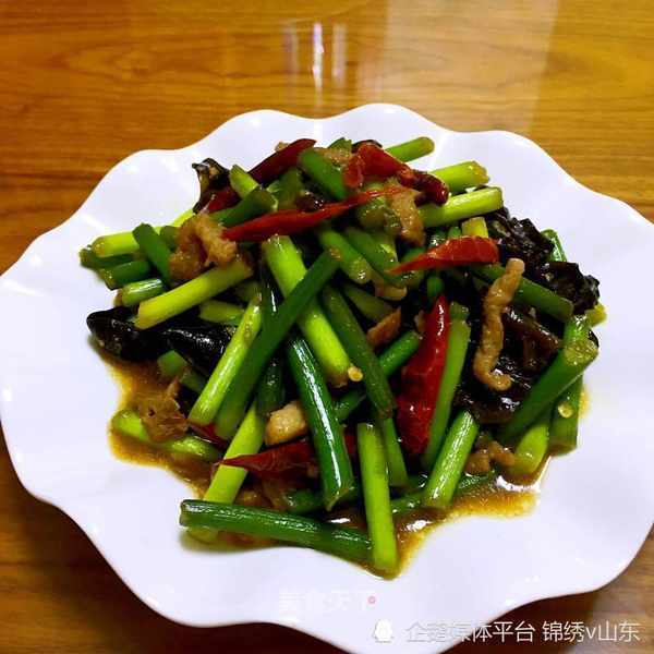 食材:蒜苔,黑木耳,豬瘦肉,幹辣椒(也可以不放)薑,生抽,玉米淀粉,鹽,植物油,料酒