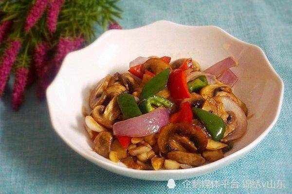 2、碗裡加入適量食鹽、雞精、淀粉、清水,用筷子攪拌成料汁。蒜瓣、香蔥切末,起鍋燒油,放入蔥薑末爆香,倒入口蘑、青椒、彩椒,大火翻炒1分鐘,淋入料汁大火收汁,即可出鍋。
