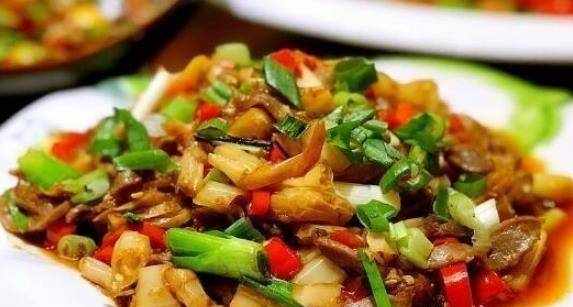 1.雞肚洗凈,切成薄片,加入薑末和紅辣椒末,用料酒醃約20分鐘;