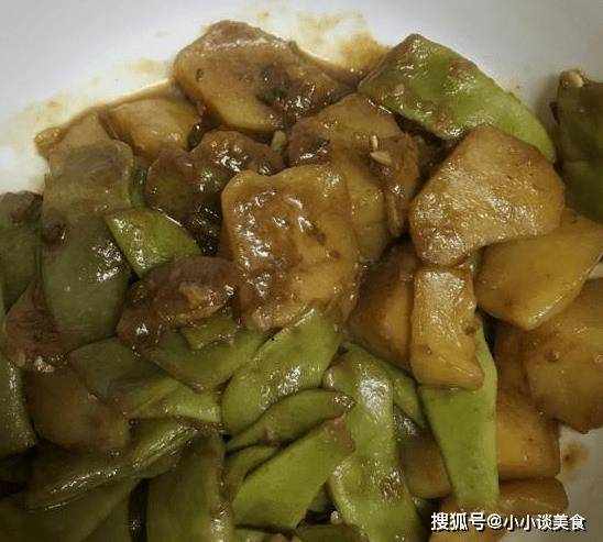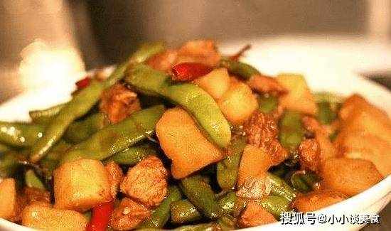 3、起鍋,鍋內油燒熱,放入蔥、薑、蒜爆香,將肉炒熟,下豆角炒至生,加入土豆丁繼續炒,加少許醬油。醬汁和雞精