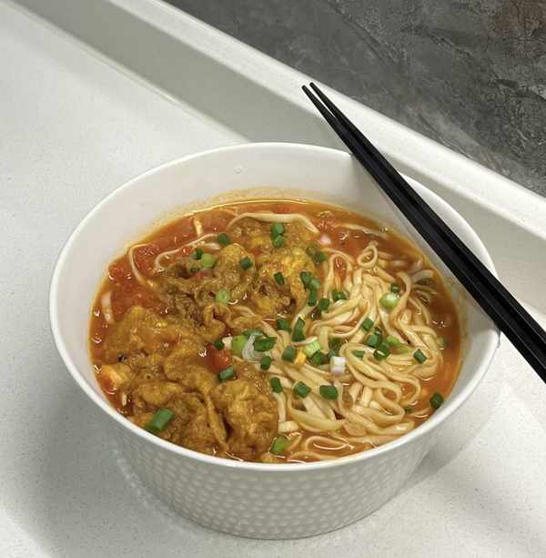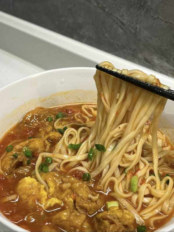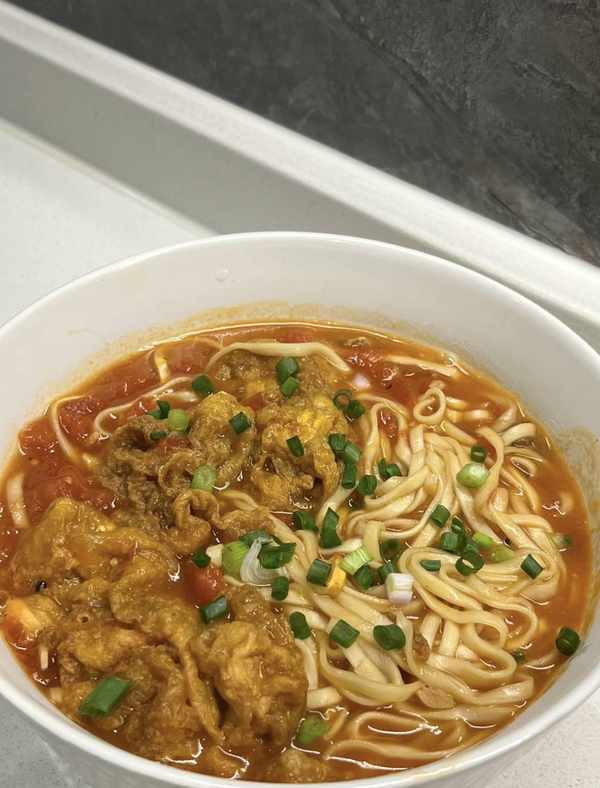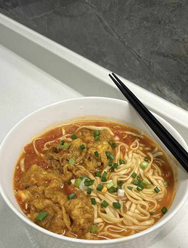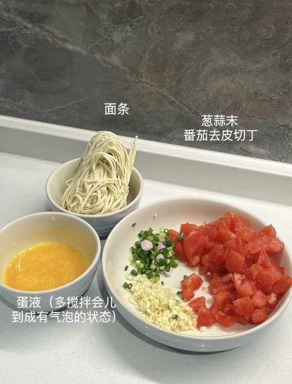 2 番茄去皮切丁 油熱下蒜末炒香 放入番茄丁和小勺鹽炒化 加入適量清水燒開 加生抽 鹽白胡椒粉番茄醬 白糖熬一會兒放入面條煮熟 最後放入炸蛋吸滿湯汁即可