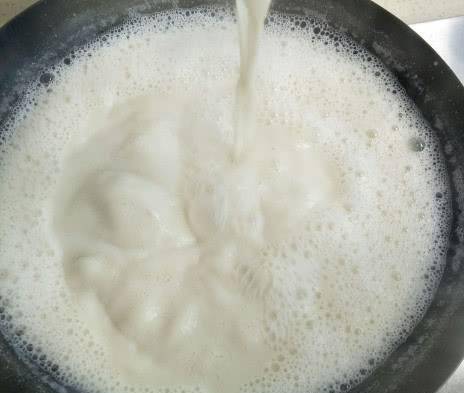 將豆漿倒入鍋中煮一會,去腥味。加入醋和少許水。比例是每150毫升水加10毫升醋。倒入後攪拌均勻,靜置30分鐘。