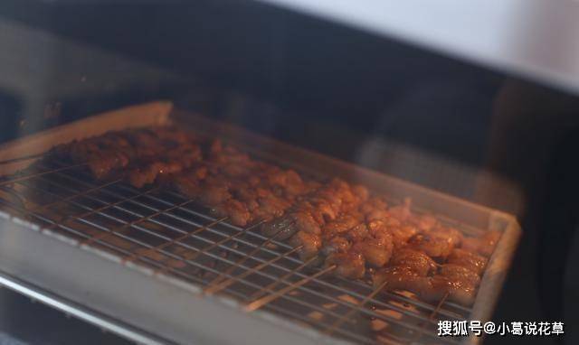 5、烤箱中下層210度烤13分鐘,取出烤盤,肉串翻一圈再烤6分鐘!烤好後可以再撒上孜然粉