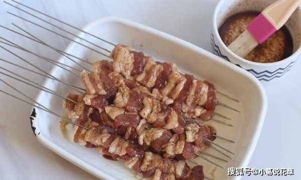 4.今天用烤箱烤,因為太熱瞭,不想扔掉太多工具。爐子很舒服。在烤盤上鋪上防油紙或箔紙以保護烤盤。如果沒有滲油,則無需清洗。將烤網放在烤盤上。為防止肉粘在烤網上,用刷子蘸少許油把烤網上刷幹凈,把串肉串上就行瞭!