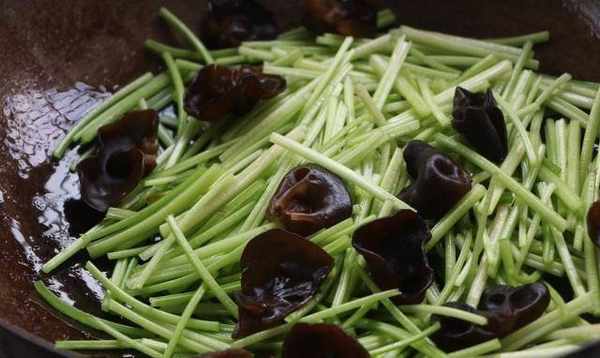 6、另取一鍋加入植物油,加入蒜末爆香,加入芹菜、香菇翻炒均勻;