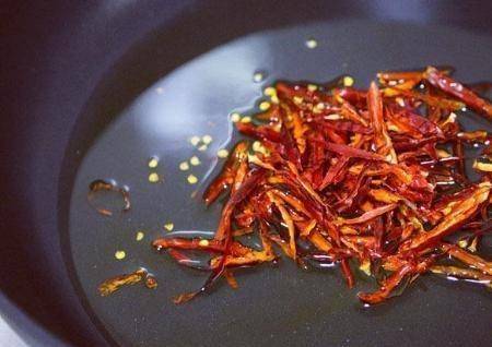 第三步,鍋中加入適量食用油,冷油倒入辣椒段,小火邊炒邊攪出香味,然後撈出辣椒,放入處理好的菊花放入其中,繼續攪拌;