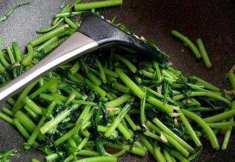 第四步將菊花小火慢炒至變軟,將菊花葉放入鍋中繼續翻炒。約2分鐘後,將切好的大蒜放入鍋中炒勻;