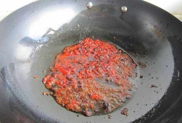 第三步:當油70%到80%熱時,將準備好的番茄調料倒入鍋中,炸至調料香出紅油,這樣炸出來的土豆更加鮮美可口。烤好後,將土豆放入鍋中,快速搖晃,讓每一塊土豆都裹上一層。攪拌均勻後,在鍋中倒入適量的水。