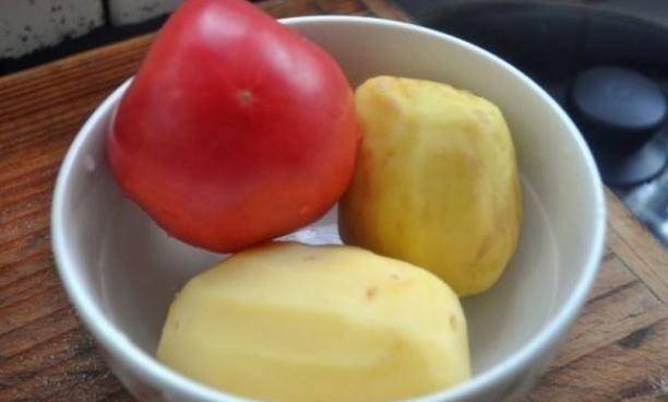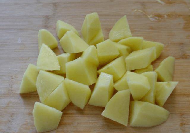 第一步:將買回來的土豆用清水沖洗幹凈,去除土豆表面的雜質。土豆洗凈去皮,用冷水沖洗,這樣切的時候就沒有雜質瞭。土豆洗凈後切塊,放入碗中,倒入適量清水浸泡片刻,去除多餘的土豆淀粉,讓土豆入味更佳。