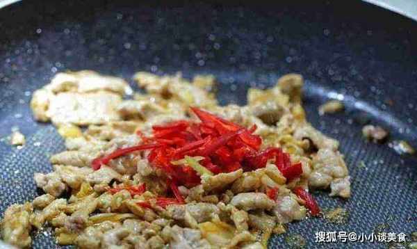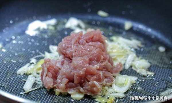 4、炒至蔥花變黃,放入肉片,大火翻炒幾下,至變白變脆。時間不要太長,時間長瞭肉變老瞭,不好吃。
