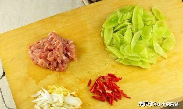 2.將沙拉斜切。斜切可以使沙拉片更大,更容易準備,也更容易品嘗。瘦豬肉也切成薄片。其他的材料,紅辣椒切成片,大蔥切成蔥花,大蒜切成蒜片備用。