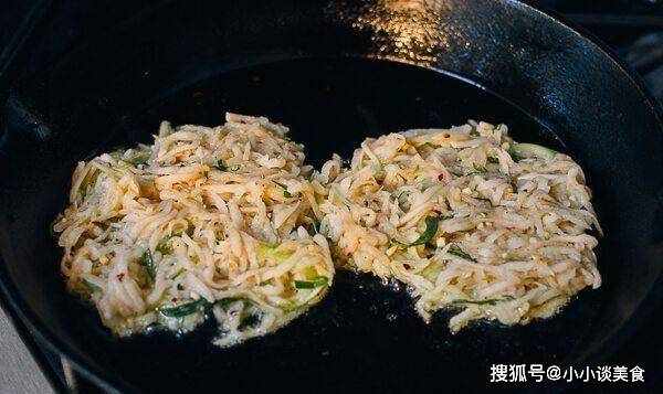 第二步:平底鍋倒入油,用中火將油加熱至70-80%左右,然後將第一步的土豆泥混合物舀出,用抹刀分成小餅,在一個上炸3-5分鐘。直到它變得有吸引力,它是金黃色的!定期旋轉它以避免剝落,因為它看起來不太好。