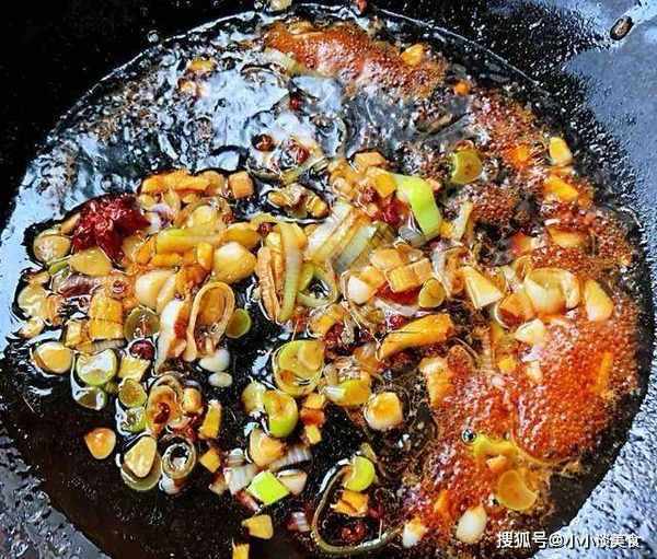 5、鍋中倒入底油,燒熱。加入花椒、八角炒香,再加入蔥、薑、蒜炒香。加入調味一品鮮醬油、蠔油和糖拌勻
