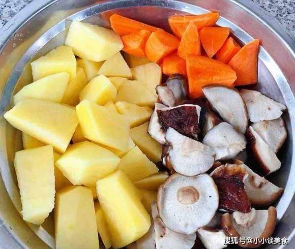4.土豆和胡蘿卜切成和香菇一樣大小,瀝幹備用